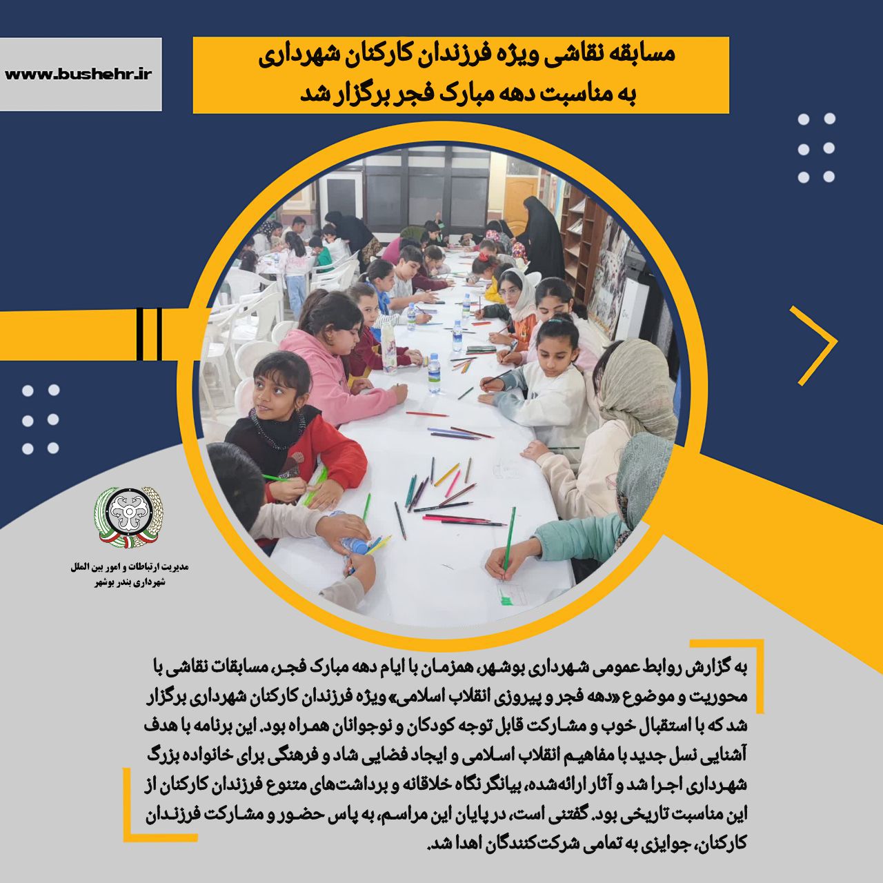 برگزاری مسابقه نقاشی ویژه فرزندان کارکنان شهرداری به مناسبت دهه مبارک فجر <div> </div> <div>به گزارش روابط عمومی شهرداری بوشهر، همزمان با ایام دهه مبارک فجر، مسابقات نقاشی با محوریت و موضوع «دهه فجر و پیروزی انقلاب اسلامی» ویژه فرزندان کارکنان شهرداری برگزار شد که با استقبال خوب و مشارکت قابل توجه کودکان و نوجوانان همراه بود.</div> <div> </div> <div>این برنامه با هدف آشنایی نسل جدید با مفاهیم انقلاب اسلامی و ایجاد فضایی شاد و فرهنگی برای خانواده بزرگ شهرداری اجرا شد و آثار ارائهشده، بیانگر نگاه خلاقانه و برداشتهای متنوع شرکتکنندگان از این مناسبت تاریخی بود.</div> <div> </div> <div>در پایان این مراسم، به پاس حضور و مشارکت فرزندان کارکنان، جوایزی به تمامی شرکتکنندگان اهدا شد.</div>